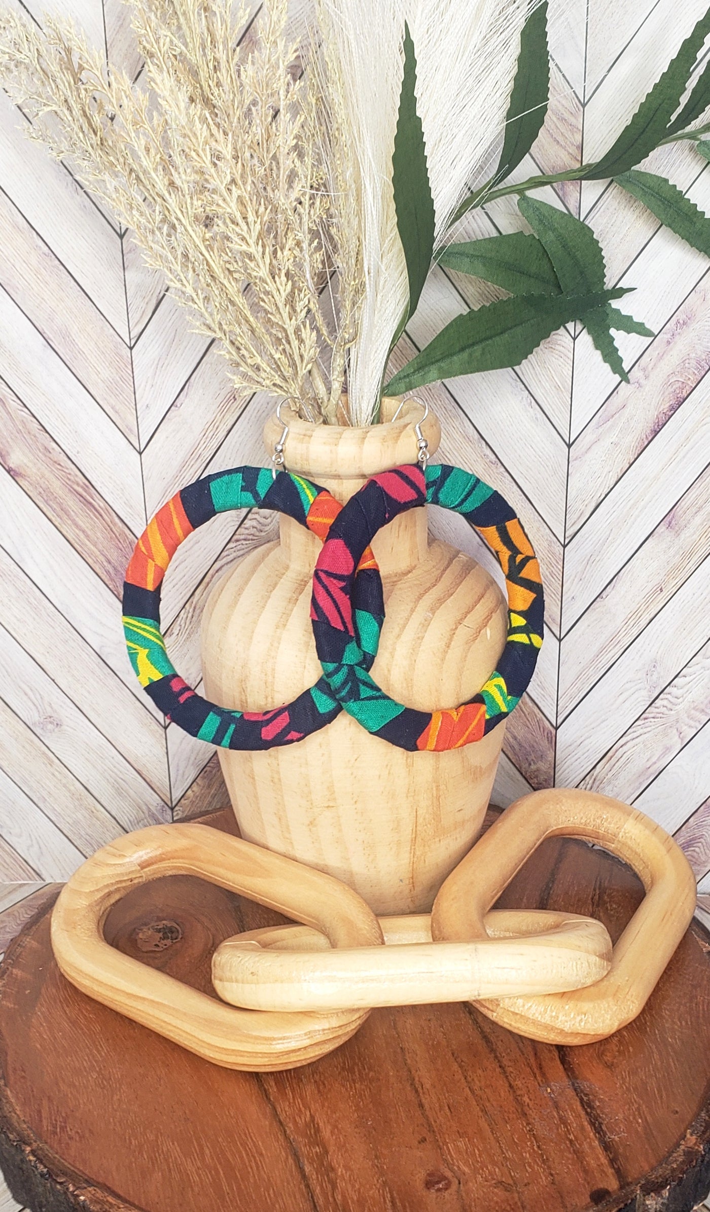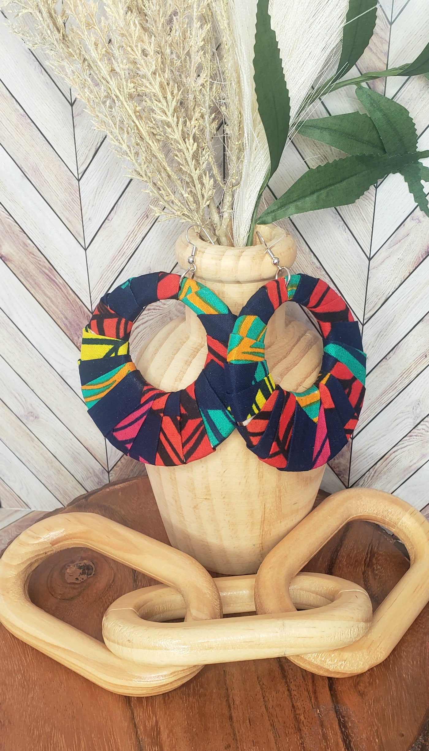 The Ancestral Bloom Hoop Earrings are a bold expression of identity, heritage, and self-definition. Crafted from vibrant Afrocentric fabric adorned with flowing leaf motifs, this set symbolizes growth, rootedness, and the beauty of becoming.