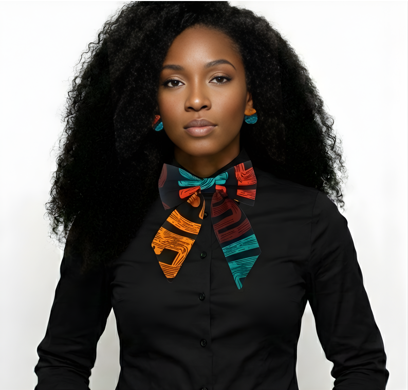 Rich earth tones of burnt orange, golden ochre, deep brown, and turquoise dance against a powerful black backdrop, symbolizing protection, wisdom, resilience, and ancestral continuity. Every curve and mark represents ancestral language, reimagined as wearable art.