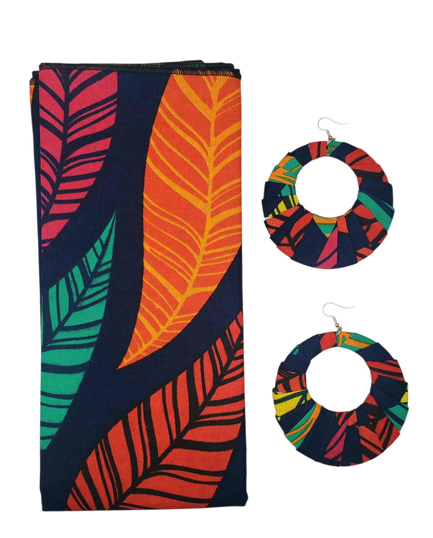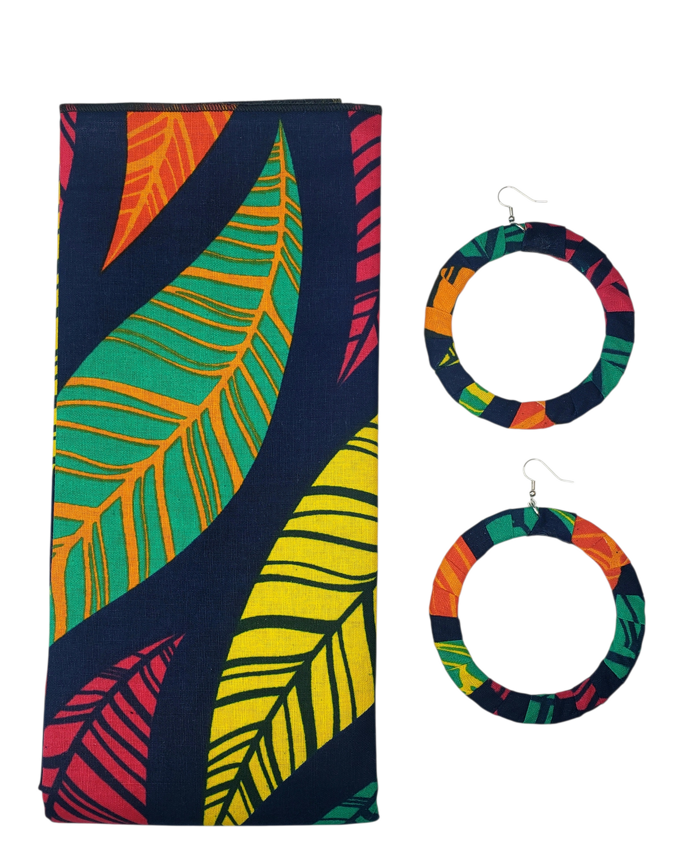 The Ancestral Bloom Head Wrap & Hoop Earring Set is a bold expression of identity, heritage, and self-definition. Crafted from vibrant Afrocentric fabric adorned with flowing leaf motifs, this set symbolizes growth, rootedness, and the beauty of becoming.