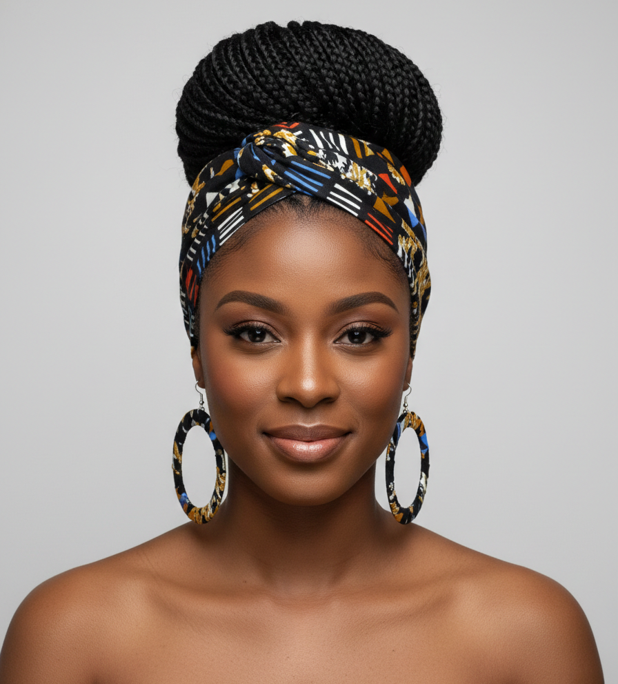 Brighten your fall style with the "Nakia 3" Multicolored Ankara Head Wrap or Set. Featuring a playful mix of blue, brown, black, and orange tones, this versatile accessory adds a vibrant touch while complementing neutral fall wardrobes. Perfect for cozy days or spirited outings, it brings energy and charm to your seasonal look.